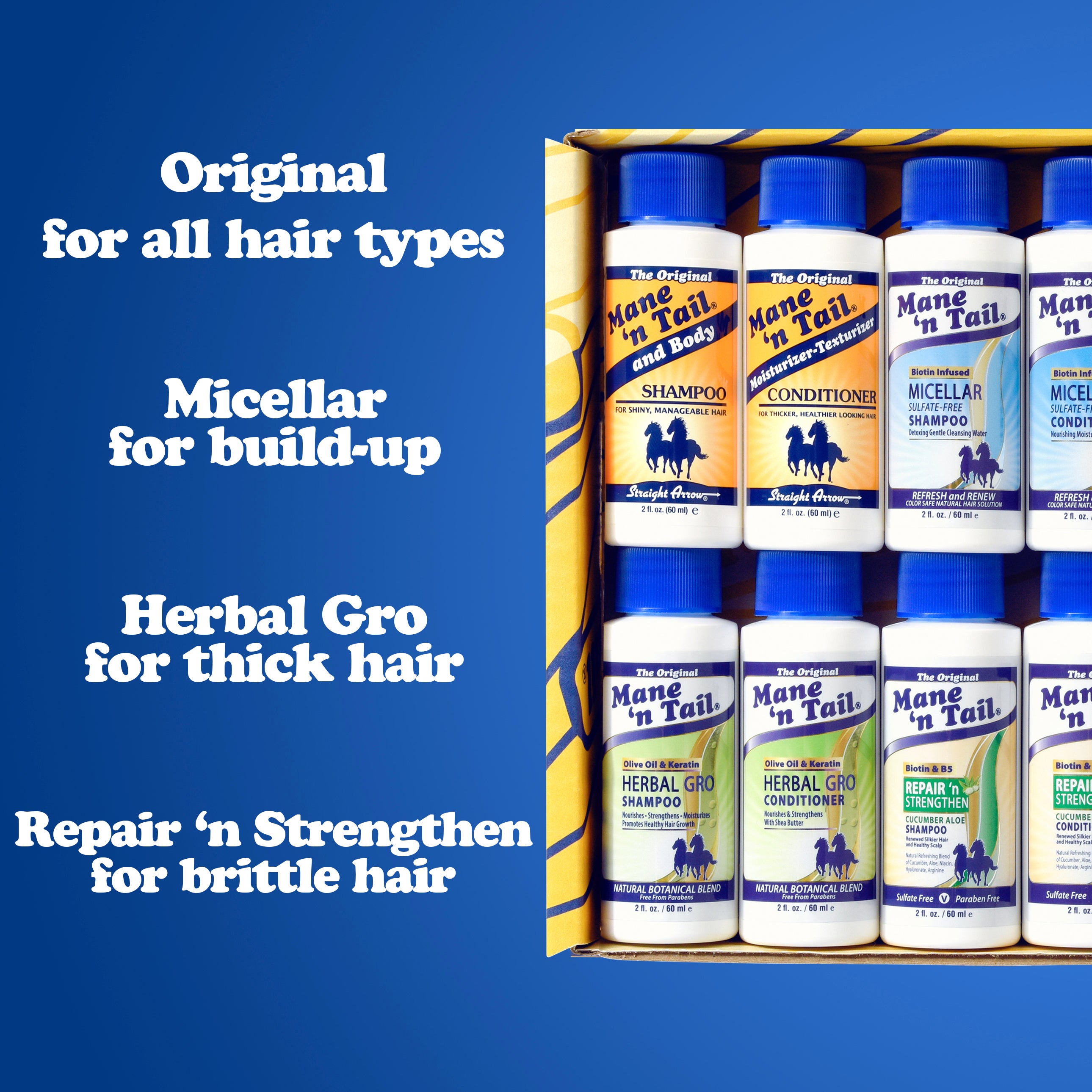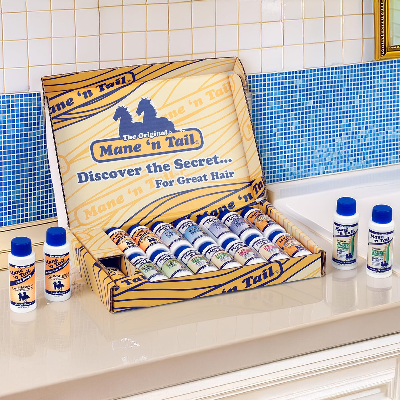 Products include Mane 'n Tail Original Shampoo and Conditioner 2oz, Mane 'n Tail Micellar Shampoo and Conditioner 2oz, Mane 'n Tail Herbal Gro Shampoo and Conditioner 2oz, Mane 'n Tail Repair 'n Strengthen Shampoo and Conditioner 2oz, Mane 'n Tail Deep Moisture Shampoo and Conditioner 2oz, Mane 'n Tail Color Protect Shampoo and Conditioner 2oz, Mane 'n Tail Detangler 2oz, Mane 'n Tail Hair Strengthener 2oz, and Mane 'n Tail Hoofmaker 1oz.