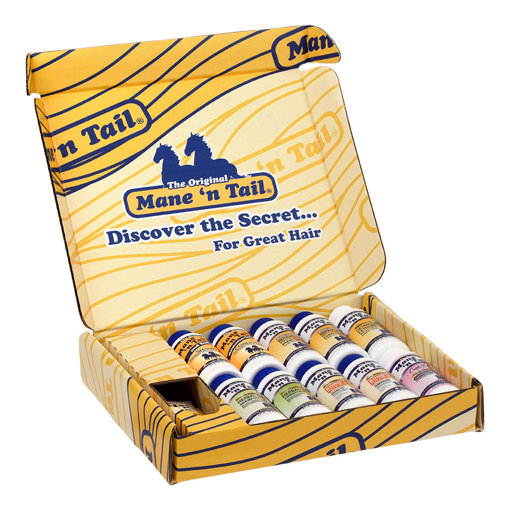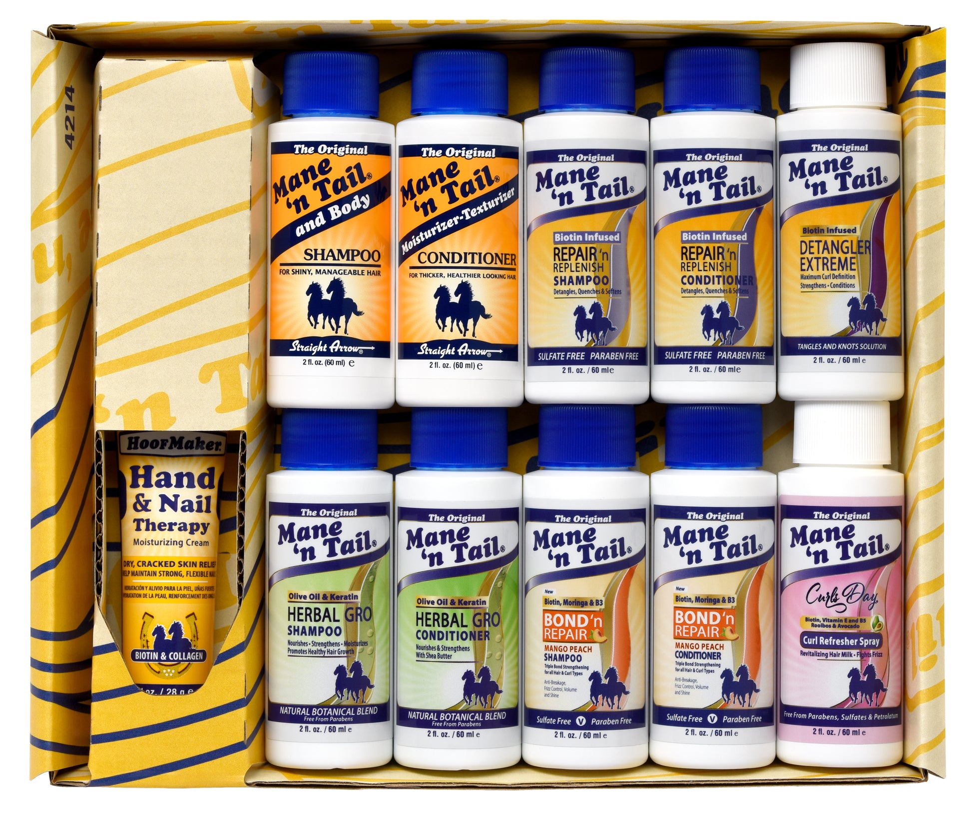Products include Mane 'n Tail Original Shampoo and Conditioner 2oz, Mane 'n Tail Repair 'n Replenish Shampoo and Conditioner 2oz, Mane 'n Tail Herbal Gro Shampoo and Conditioner 2oz, Mane 'n Tail Bond 'n Repair Shampoo and Conditioner 2oz, Mane 'n Tail Detangler Extreme 2oz, Mane 'n Tail Curl Refresher Spray 2oz, and Mane 'n Tail Hoofmaker 1oz.